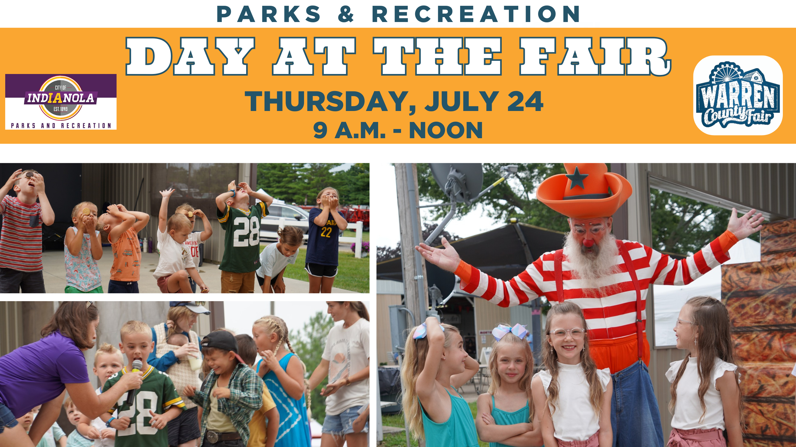 Staff from Parks and Recreation departments in Indianola, Carlisle and Norwalk will host a morning of contests and challenges at the Warren County Fair on Thursday, July 24, from 9 a.m.-Noon on the Free Entertainment Stage.
